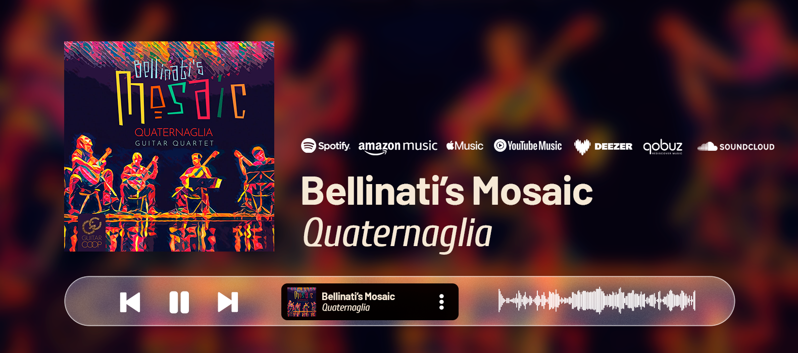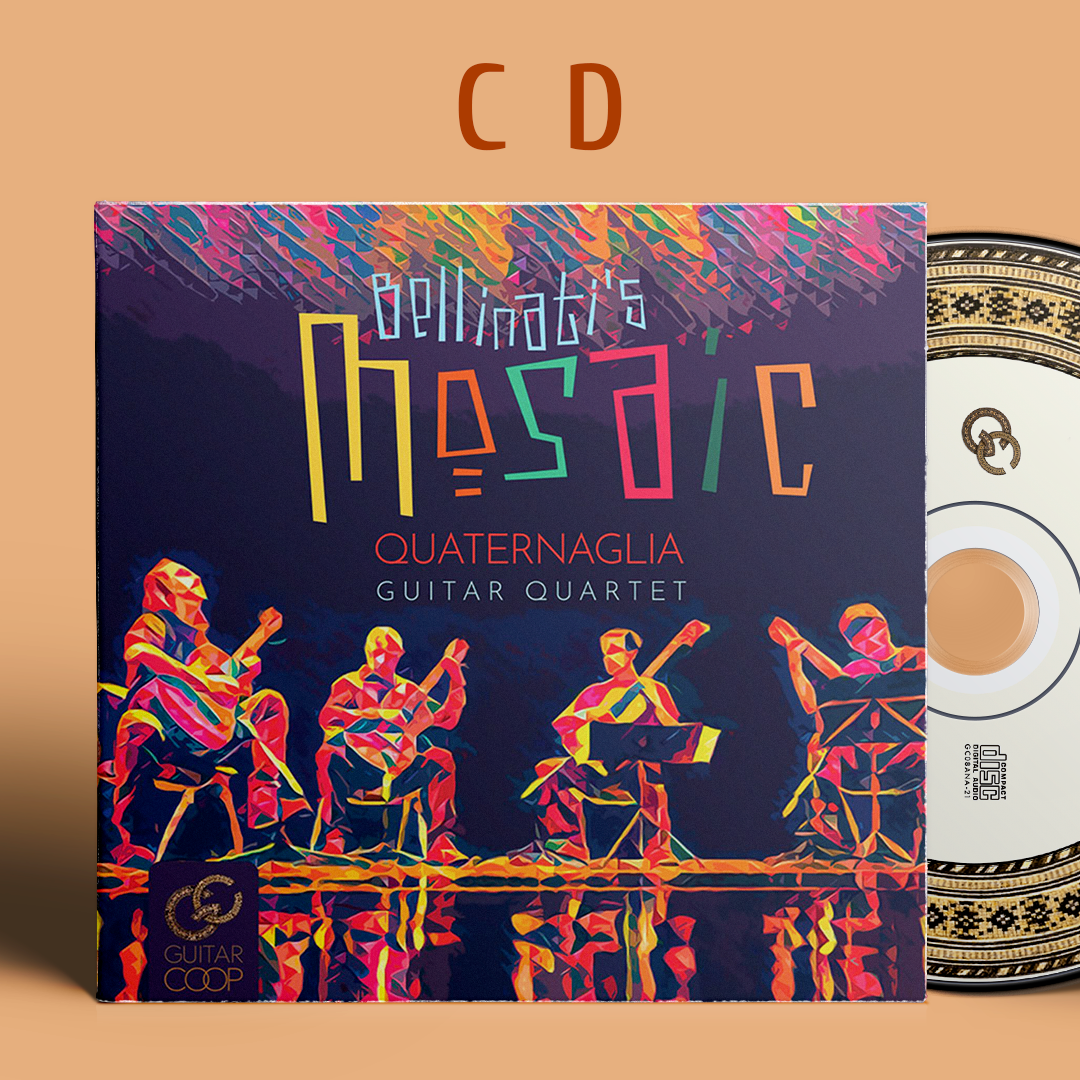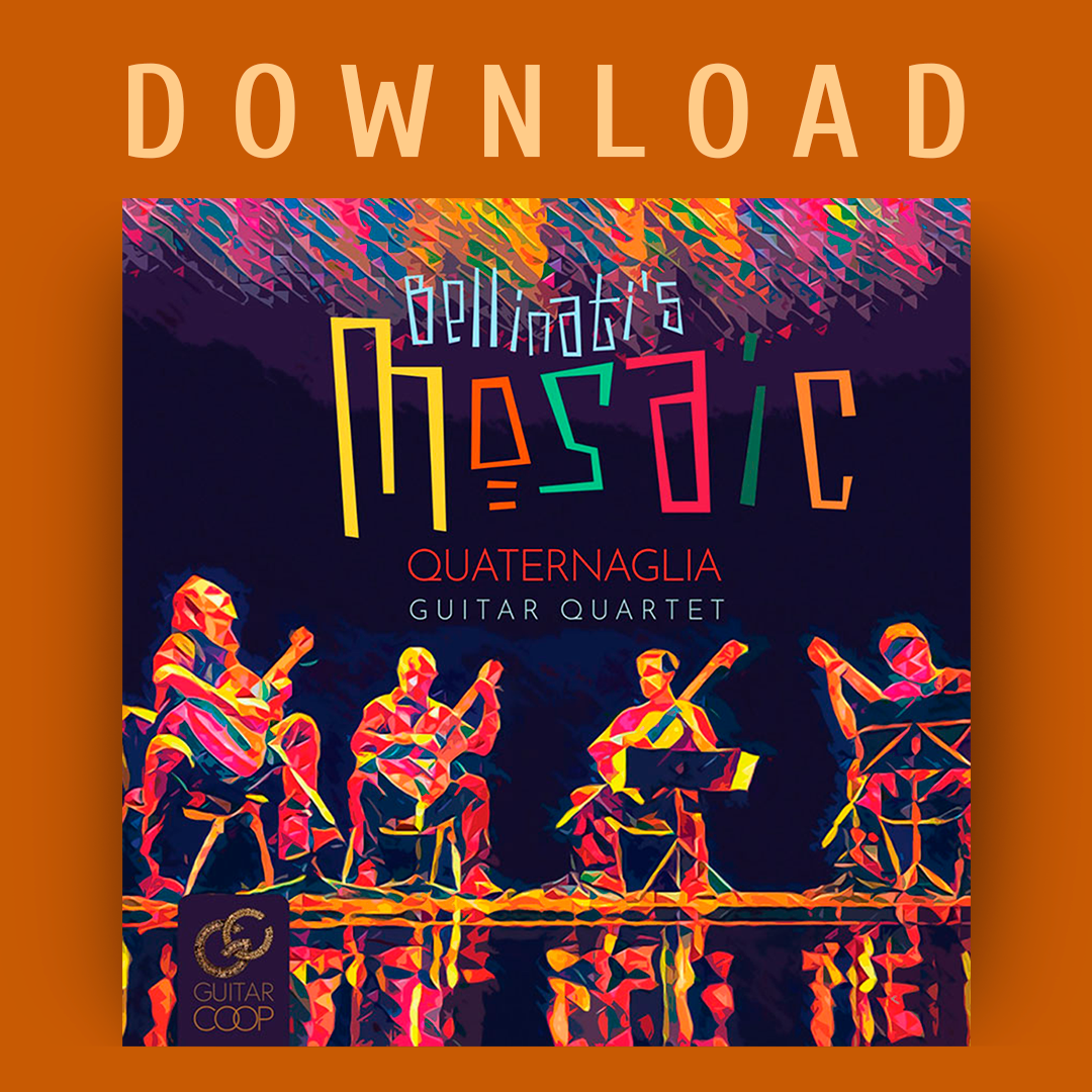 Bellinati’s Mosaic – Quaternaglia reúne a obra completa para quarteto de violões de Paulo Bellinati, um dos compositores centrais na consolidação e internacionalização do violão brasileiro a partir dos anos 1980. O álbum apresenta um panorama coerente e representativo de sua escrita camerística, marcada pelo domínio idiomático do instrumento e pela integração de gêneros fundamentais da música brasileira, como lundu, maxixe, baião, frevo, maracatu e valsa.